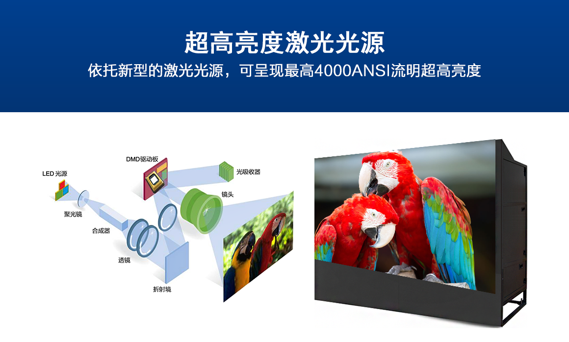4:3激光光源DLP背投大屏幕產品采用激光固態光源設計、多信道輸入備份設計,特色的色彩亮度調整、信號數據化傳輸編碼技術及六色調整等先進技術,單元內置高性能嵌入式拼接處理器,支持全高清信號輸入顯示,具有長壽命、免維護、高亮度、色彩表現力強、低功耗、綠色環保等特點,是各類應急指揮調度、安全生產監控、多媒體會商等綜合信息監控場所數字顯示拼接墻系統的理想之選。